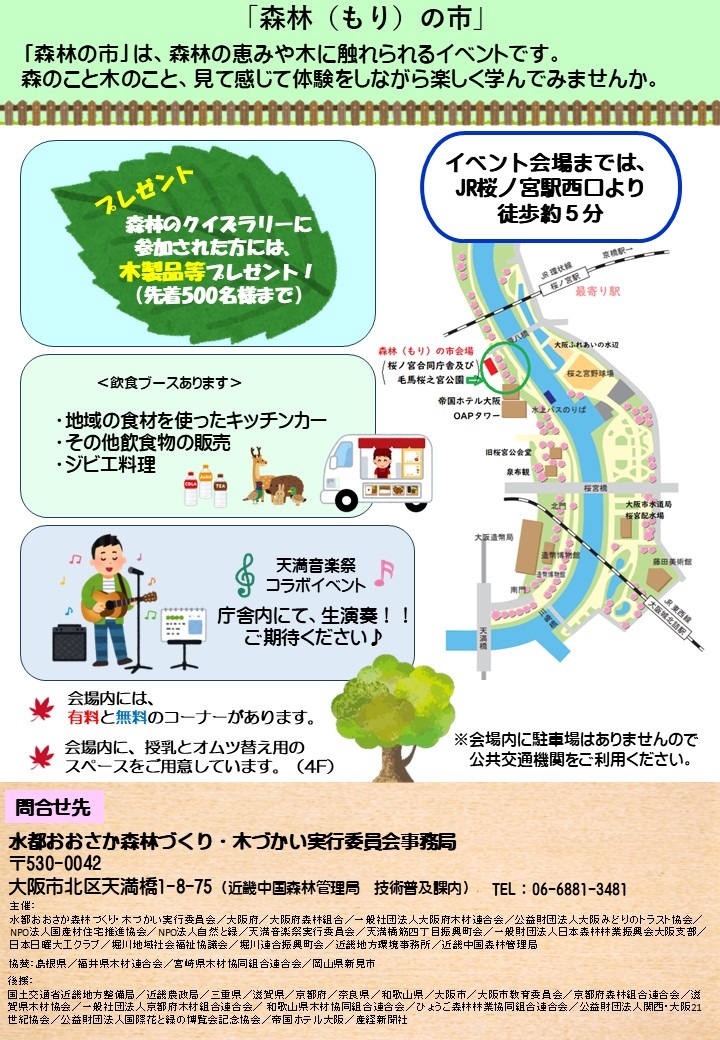 主 催 | 「水都おおさか森林づくり・木づかい実行委員会」メンバー 大阪府、大阪府森林組合、(一社)大阪府木材連合会、(公財)大阪みどりのトラスト協会、NPO法人国産材住宅推進協会、NPO法人自然と緑、天満音楽祭実行委員会、天満橋筋四丁目振興町会、(一財)日本森林林業振興会大阪支部、日本日曜大工クラブ、堀川地域社会福祉協議会、堀川連合振興町会、近畿地方環境事務局、近畿中国森林管理局 |
